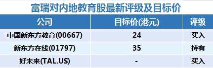 富瑞發(fā)表內(nèi)地教育股研究報(bào)告表示,首次覆蓋5家中國內(nèi)地教育股票,其中好未來教育集團(tuán)(TAL.US)和中國東方教育(00667)將是首選股,因?yàn)檫@2家公司是后公共衛(wèi)生事件時(shí)代的長期贏家,因而給予“買入”評(píng)級(jí),該行予中國東方教育目標(biāo)價(jià)24港元。