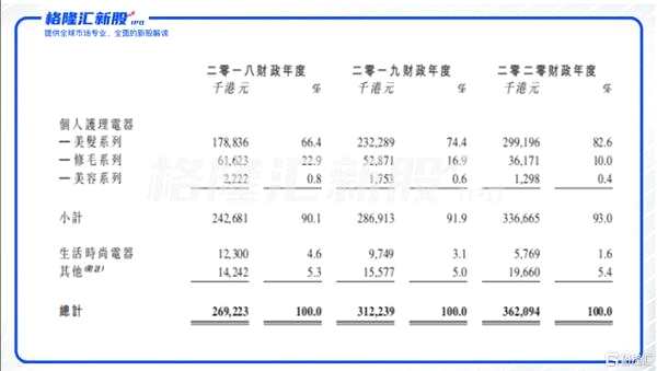 但背后也掩藏著盈利較為單一的風(fēng)險(xiǎn)。報(bào)告期內(nèi),公司大部分收益來(lái)自美發(fā)系列,包括吹風(fēng)機(jī)、卷發(fā)棒和直發(fā)夾板等產(chǎn)品,分別占總收益約66.4%、74.4%及82.6%,占比不斷上升。同期,修毛系列、美容系列兩類(lèi)產(chǎn)品的比重卻不斷下降,銷(xiāo)售額也逐年減少。