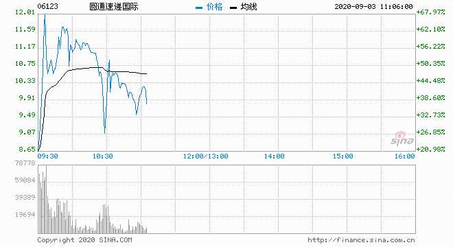 摘要: 圓通速遞國際今日早間一度站上12港元大關(guān),目前股價大幅回落,漲幅一度收窄至不足30%,目前再度上漲至42%,公司股價換手率高達(dá)37%,成交1.55億股。