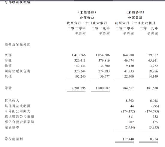 根據(jù)公司中報,公司業(yè)務(wù)收入主要來自空運(yùn)收入14億,占到公司的64%,其他還有海運(yùn)和國際快遞業(yè)務(wù)占比較大,其中海運(yùn)業(yè)務(wù)收益減少14%,國際快遞及包裹服務(wù)毛利于報告期內(nèi)增加至約4470萬港 元(二零一九年上半年:約20.9百萬港元),大幅增長約113.9%。