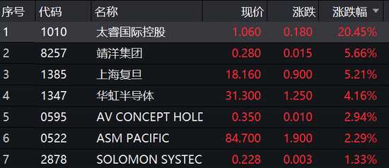 港股半導(dǎo)體及元件概念短線走高,太睿國際控股漲超20%,上海復(fù)旦漲5.21%,華虹半導(dǎo)體漲4.33%,中芯國際漲1%。