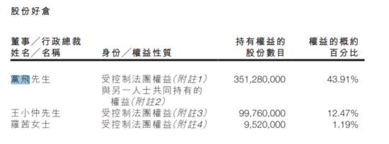 公司董事局主席黨飛持有公司43.91%的股權(quán),大約3.5億股。
