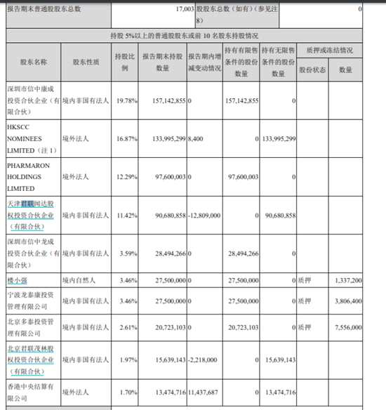 根據(jù)康龍化成中期報(bào)告,公司第一大機(jī)構(gòu)股東為中信證券(600030,股吧),旗下信中康成持股19.78%,信中龍城持股3.59%,合計(jì)持股23.37%。君聯(lián)資本旗下君聯(lián)聞達(dá)、君聯(lián)茂林合計(jì)持股13.39%。君聯(lián)聞達(dá)、君聯(lián)茂林和 Wish Bloom 均為聯(lián)想控股旗下君聯(lián)資本的旗下公司。