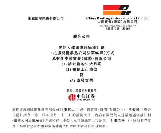9月7日消息,中國寶豐國際(03966-HK)公布,東毅國際集團(tuán)有限公司(要約人)與該公司聯(lián)合刊發(fā)日期為2020年7月23日的計劃文件,內(nèi)容有關(guān)要約人建議透過協(xié)議計劃(根據(jù)公司法第86條)方式私有化該公司及建議撤銷上市地位。