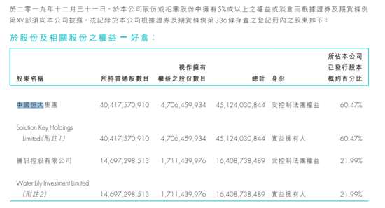具體持股來看,中國(guó)恒大持股60.47%,騰訊持股21.99%。