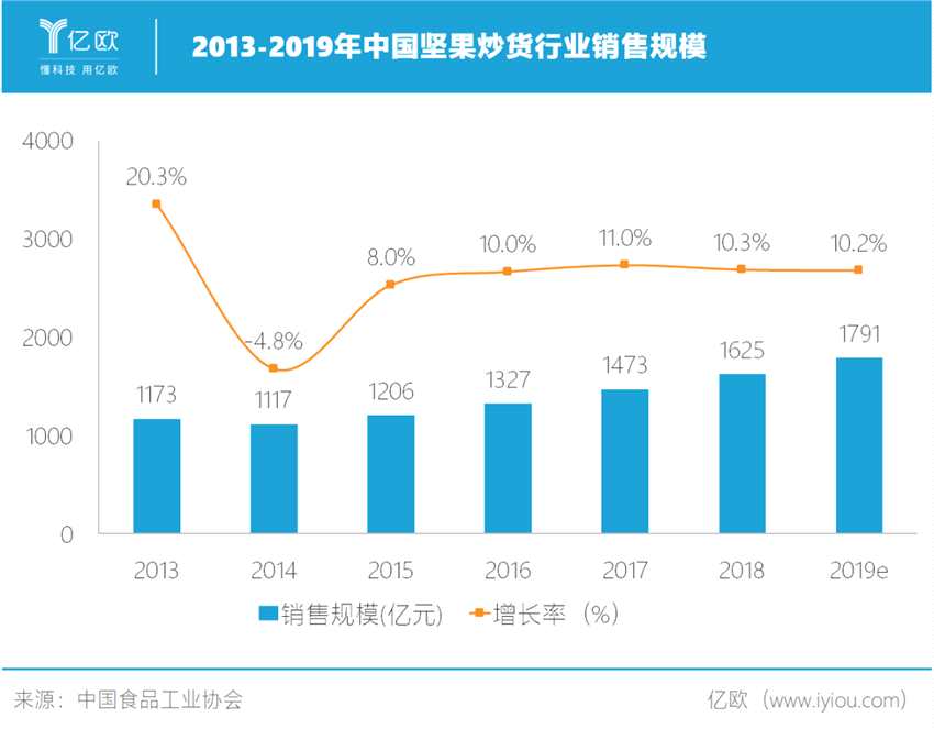 中國食品工業(yè)協(xié)會數(shù)據(jù)顯示,2018年我國堅果炒貨行業(yè)規(guī)模以上企業(yè)銷售規(guī)模達(dá)1625億元,未來2-3年內(nèi)將持續(xù)保持高速增長態(tài)勢。