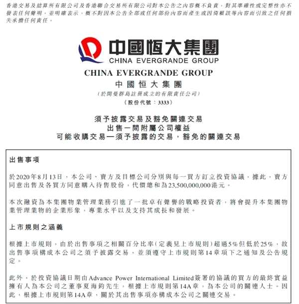8月13日夜間,中國恒大發(fā)布公告稱,旗下物業(yè)管理業(yè)務(wù)將合計(jì)引入235億港元戰(zhàn)略投資。