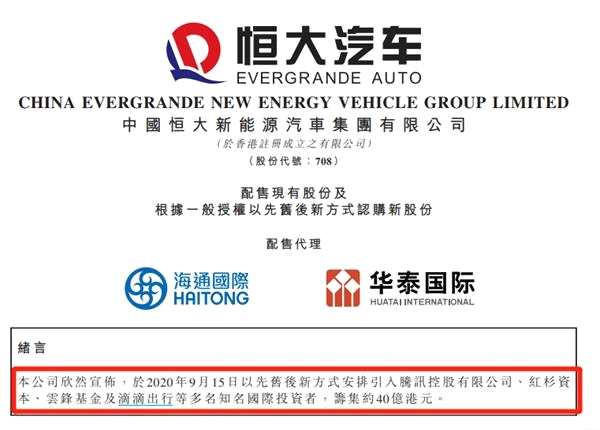 9月15日,恒大汽車發(fā)布最新公告,通過配售新股募資40億港元,引入的戰(zhàn)略投資者包括云鋒基金、騰訊、紅杉資本、滴滴等知名投資者。