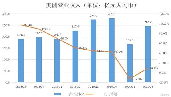 若分季度來看美團(tuán)上市之后的業(yè)績,美團(tuán)的單季度營收已經(jīng)從2019年三季度的191億元人民幣提升到了2019年第四季度的281.6億元人民幣。2020年由于疫情的影響,美團(tuán)于一季度出現(xiàn)收入的短暫下滑,但今年第二季度,即疫情之后的最新一季財報,美團(tuán)的營業(yè)收入增長率已經(jīng)由負(fù)轉(zhuǎn)正,同比增長8.9%至247億元人民幣,經(jīng)調(diào)整凈利潤同比增長82%至27億元人民幣,超出市場預(yù)期,反映出公司業(yè)績已經(jīng)顯著回暖。