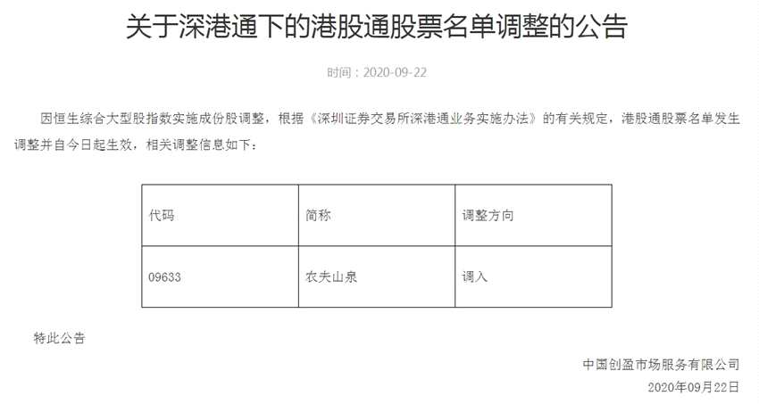 農(nóng)夫山泉調(diào)入港股通股票名單 即日起生效