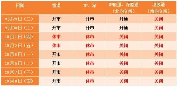 滬股通、深股通(北向交易):10月1日至 10月8日關閉交易;