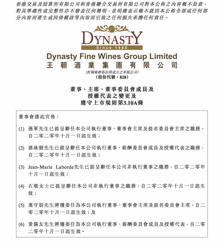 9月30日,王朝酒業(yè)集團(tuán)有限公司(以下簡稱“王朝酒業(yè)”)發(fā)布公告稱,公司的董事、主席、董事委員會成員及授權(quán)代表發(fā)生變動。