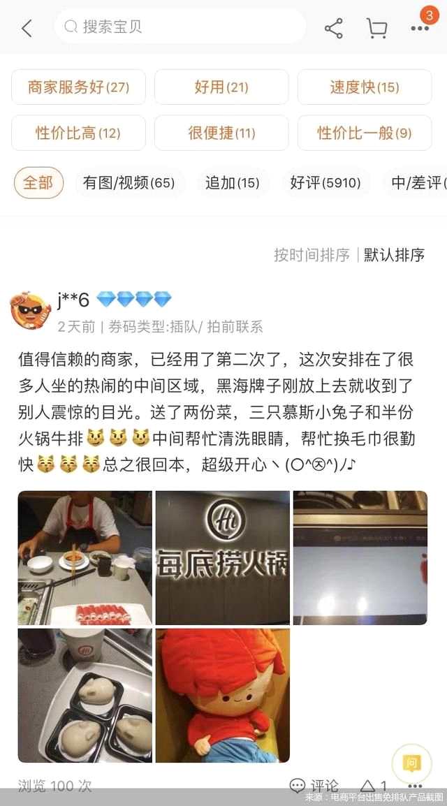 早在今年一月份,抖音平臺(tái)便有消費(fèi)者爆料,在某電商平臺(tái)充斥著大量的海底撈免排隊(duì)服務(wù)產(chǎn)品,其中排名第一的服務(wù)產(chǎn)品月售銷量超過(guò)3000人付款,并有部分顧客評(píng)論已不止第一次購(gòu)買,表示會(huì)多次回購(gòu)。也有消費(fèi)者表示,海底撈免排隊(duì)的費(fèi)用在10-40元左右,相當(dāng)于一頓外賣,費(fèi)用偏高。