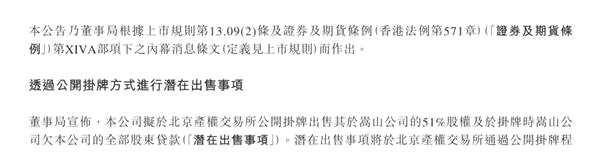 河南商報記者注意到,10月8日,香港中旅國際投資有限公司(以下簡稱“港中旅”,股票代碼00308.HK)發(fā)布公告表示,公司董事局宣布擬于北京產(chǎn)權(quán)交易所公開掛牌出售其于港中旅(登封)嵩山少林文化旅游有限公司的51%股權(quán)及于掛牌時嵩山公司欠公司的全部股東貸款。