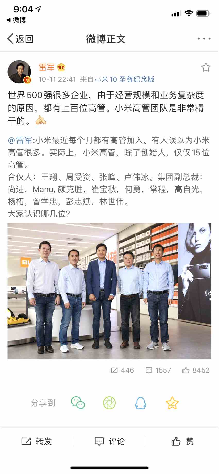 雷軍公布小米高管名單:包括常程在內(nèi)15人 稱團(tuán)隊(duì)精干