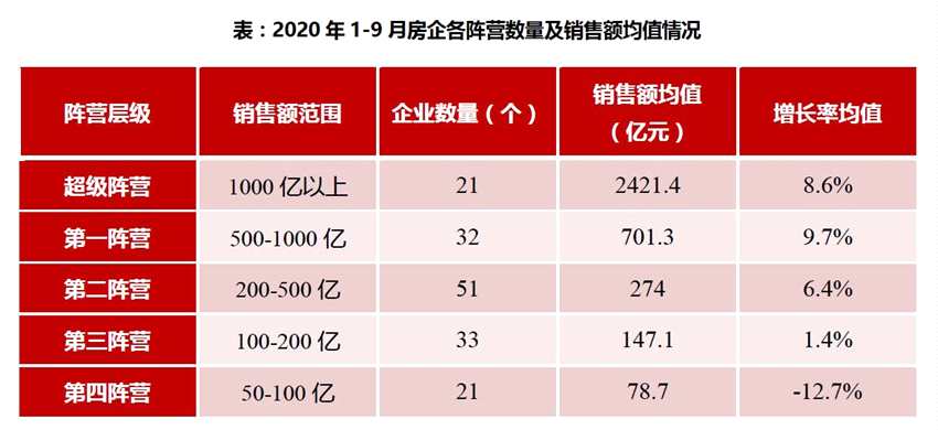 數(shù)據(jù)顯示,2020年1-9月TOP100房企銷售額均值為864.6億元,增長率均值為7.6%;其中銷售額超千億房企有21家,較去年同期增加1家;超百億房企137家。