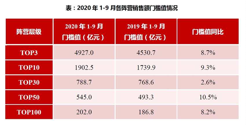從TOP100門檻來看,數(shù)據(jù)顯示,2020年1-9月,TOP100門檻值為202億元。其中,TOP3房企門檻值為4927.0億元,較上年增長8.7%;TOP10房企門檻值為1902.5億元,較上年增長9.3%;TOP30房企門檻值為788.7億元,較上年增長2.6%;TOP50房企及TOP100房企門檻值分別為545.0億元、202.0億元,同比分別增長10.5%和8.2%。