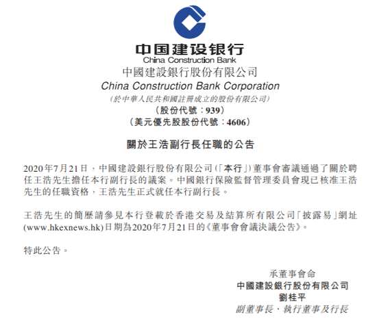 建設(shè)銀行:王浩正式就任本行副行長