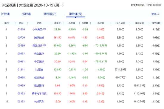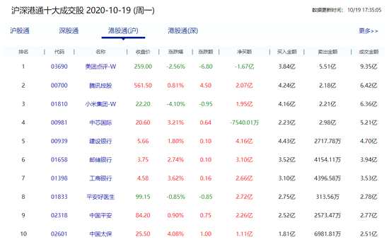南向資金凈流入25.95億元,港股通(滬)市場,美團獲賣出1.67億港元,騰訊獲買入2.07億,小米獲買入1.95億,中芯國際遭賣出,建行、郵儲、工行獲得大幅買入近10億。