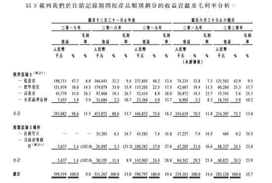 智欣集團(tuán)的收益主要來自于預(yù)拌混凝土,根據(jù)招股書,2017-2019年度,公司來自預(yù)拌混凝土的收益分別約為3.94億元、4.53億元以及4.47億元,分別占總收入的98.6%、88.6%以及75.6%,逐年下降。