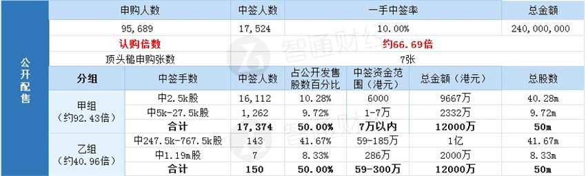 其中,公開配售申購(gòu)人數(shù)95689人,一手中簽率10%,認(rèn)購(gòu)倍數(shù)約66.69倍。