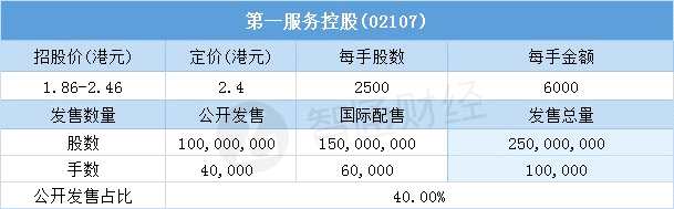 10月21日,第一服務(wù)控股(02107)配售結(jié)束。配售招股價(jià)區(qū)間為1.86-2.46港元,最終定價(jià)2.4港元,每手6000港元。
