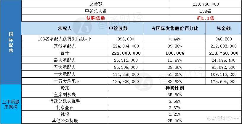 國際配售申購人數(shù)未披露,認(rèn)購倍數(shù)約1.1倍。