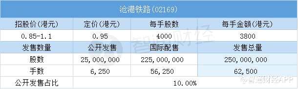 10月22日,滄港鐵路(02169)配售結(jié)束。配售招股價(jià)0.85-1.1港元,最終定價(jià)0.95港元,每手3800港元。