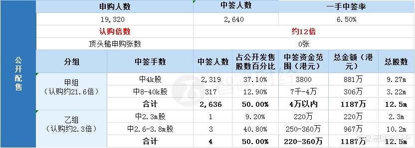 其中,公開配售申購人數(shù)19320人,一手中簽率6.5%,認(rèn)購倍數(shù)約12倍。