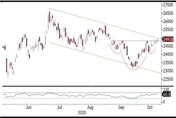國企指數(shù)向上突破。昨夜美股雖急跌,但港股之美國預(yù)托證券(ADR)跌幅不大,預(yù)視恒指今天低開不足200點(diǎn)。圖表上,恒指上周五升穿 “頭肩底” 頸線24,800,但受制于下降通道頂部25,000,短期內(nèi)料于頸線附近上落。國企指數(shù)走勢更強(qiáng),在內(nèi)銀股帶動下,已升穿 “頭肩底” 頸線和下降通道頂部,有望進(jìn)一步向上。