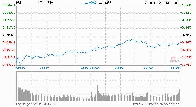 10月29日消息,美股周三大幅收跌,三大股指跌幅均超3.4%。道指重挫940點(diǎn),創(chuàng)6月以來的最大單日跌幅。美歐疫情形勢嚴(yán)峻,德法或出臺更嚴(yán)格限制措施。美國大選結(jié)果仍不確定,新一輪財(cái)政刺激方案仍陷僵局。今日恒指低開1.69%,后跌幅收窄。截止收盤,恒生指數(shù)跌0.49%,報(bào)24586.60點(diǎn);國企指數(shù)跌0.08%,紅籌指數(shù)漲0.04%。
