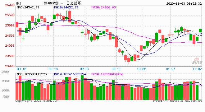 摘要: 11月3日消息,隔夜美股走高,機(jī)構(gòu)表示,未來數(shù)個交易日,預(yù)期美股將繼續(xù)波動,大家宜加倍留意。今日開盤,港股恒指高開0.94%,報24689.56點(diǎn);國企指數(shù)漲0.59%,紅籌指數(shù)漲0.64%。