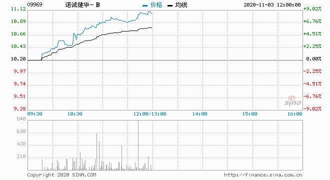 截至發(fā)稿,諾誠健華-B漲7.45%,報10.96港元,成交額606.63萬港元。