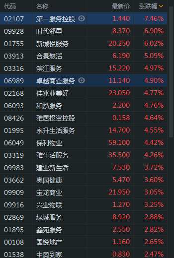 11月5日消息,物業(yè)股集體上漲,第一服務(wù)漲7.46%,時代鄰里漲6.9%,新城悅服務(wù)漲6.02%,合景悠活漲5.09%,濱江服務(wù)、卓越商企、佳兆業(yè)美好漲近5%。