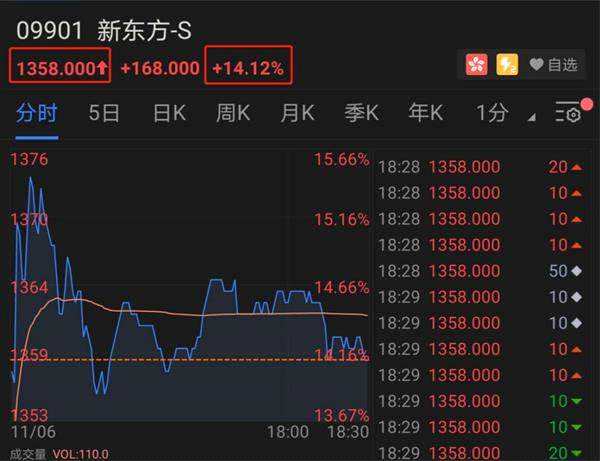 6日結(jié)束的暗盤交易中,新東方-S“收報”1358港元,上漲14.12%。