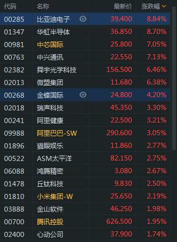 恒生科技指數(shù)漲幅擴(kuò)大至3% 比亞迪電子、華虹半導(dǎo)體漲近9%
