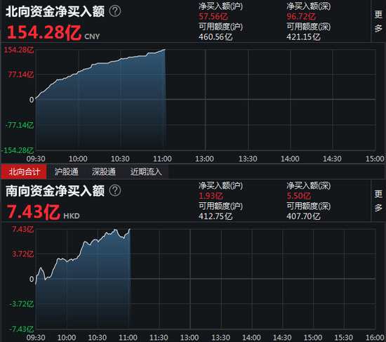 11月9日消息,北向資金凈流入超150億元,滬股通凈流入57.56億元,深股通凈流入96.72億元。