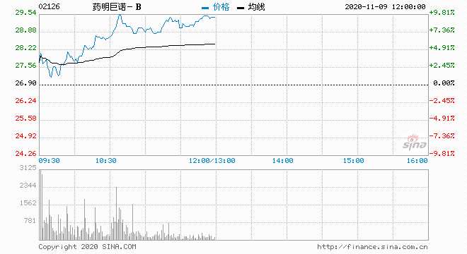 生物醫(yī)藥股重獲市場熱捧,次新股藥明巨諾-B(02126)盤中以29.6港元,刷新上市新高,較發(fā)售價23.8港元高逾24%,暫現(xiàn)三連陽,累計漲幅近40%。