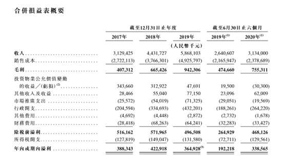 招股書(shū)顯示,2017年-2019年及2020年上半年,華潤(rùn)萬(wàn)象生活分別實(shí)現(xiàn)收入31.29億元、44.31億元、58.68億元、31.34億元。同期,毛利分別為4.07億元、6.65億元、9.42億元、7.55億元;公司期內(nèi)凈利分別為3.88億元、4.23億元、3.65億元及3.39億元。