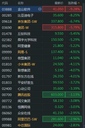 11月10日消息,恒生科技指數(shù)跌幅擴(kuò)大至4%,金山軟件跌超9%,比亞迪(002594,股吧)電子跌超8%,京東跌近7%,美團(tuán)大跌6%,網(wǎng)易跌近5%,小米跌4.11%,騰訊跌3.13%,阿里跌2.96%。