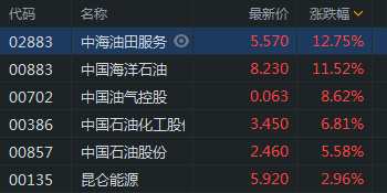 11月10日消息,石油股暴漲,中海油田服務(wù)漲12.75%,中海油漲11.52%,中石化漲6.81%,中石油漲5.58%。