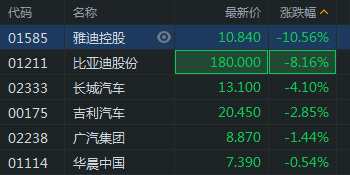 11月10日消息,汽車股走低,雅迪控股跌11%,比亞迪股份跌超8%,長(zhǎng)城汽車跌4%,吉利汽車跌3%。