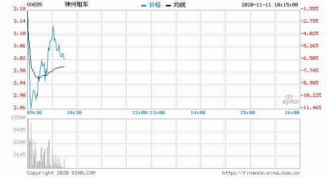 神州租車盤初一度跌超11%,截至發(fā)稿,跌6.81%,報(bào)3.01港元,成交額3112.77萬港元。