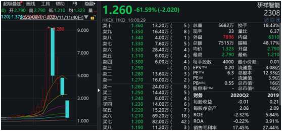 港股上市公司研祥智能最近站上了風(fēng)口浪尖。其股價(jià)近日連續(xù)暴漲暴跌。繼短短4天暴漲超500%后,股價(jià)即自由落體,11月6日跌46%、11月10日跌31%,11月11日更再度暴跌62%,累計(jì)跌幅超8成,市值蒸發(fā)近百億港元。截至最新收盤,研祥智能每股1.26港元,總市值16億港元。