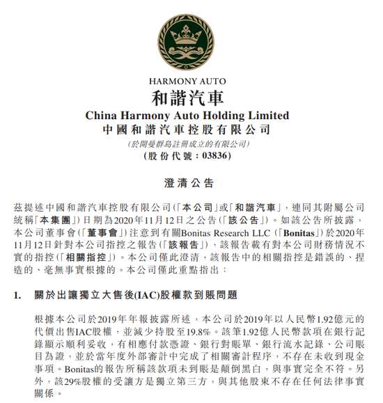茲提述中國和諧汽車控股有限公司(‘本公司’或‘和諧汽車’,連同其附屬公司統(tǒng)稱‘本集團(tuán)’)日期為2020年11月12日之公告(‘該公告’)。如該公告所披露, 本公司董事會(huì)(‘董事會(huì)’)注意到有關(guān)Bonitas Research LLC(‘Bonitas’)于2020年 11月12日針對(duì)本公司指控之報(bào)告(‘該報(bào)告’),該報(bào)告載有對(duì)本公司財(cái)務(wù)情況不實(shí)的指控(‘相關(guān)指控’)。本公司僅此澄清,該報(bào)告中的相關(guān)指控是錯(cuò)誤的、捏造的、毫無事實(shí)根據(jù)的。本公司僅此重點(diǎn)指出:
