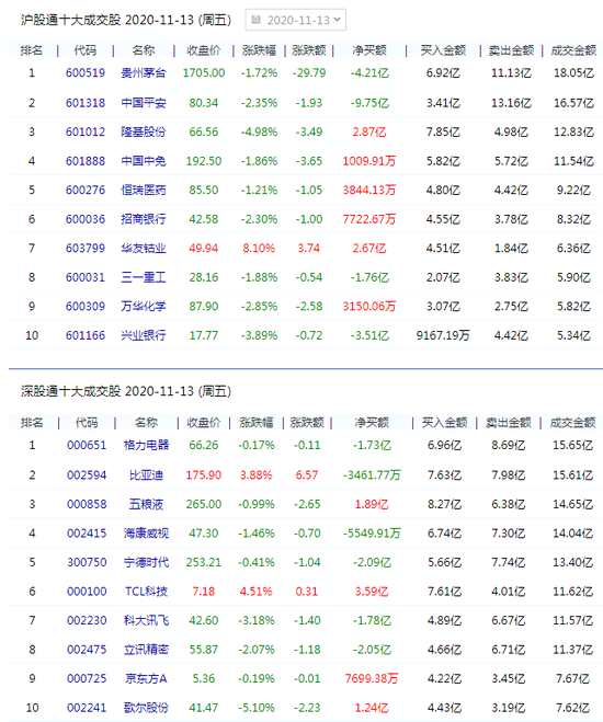 11月13日消息,北向資金凈流出49.4億元,今日凈買入TCL科技3.59億元、隆基股份(601012,股吧)2.87億元,凈賣出中國平安9.75億元、貴州茅臺(tái)(600519,股吧)4.21億元。