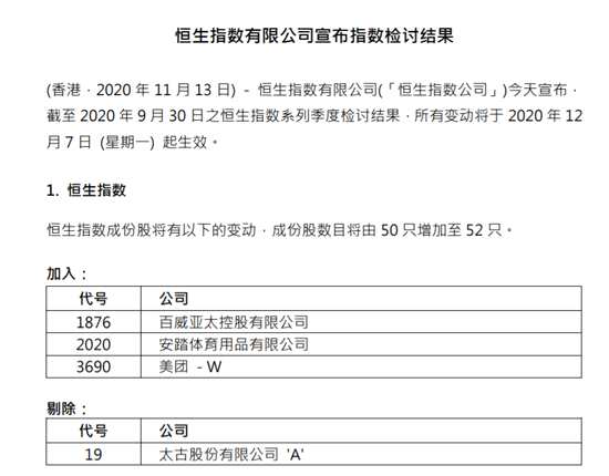 摘要: 11月13日消息,恒指指數(shù)發(fā)布季度檢討結(jié)果,恒生指數(shù)成份股數(shù)目將由50只增加至52只。美團(tuán)、安踏、百威獲納入恒指,太古股份被剔除,2020年12月7日生效。