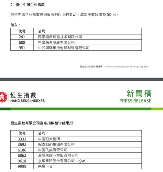 11月13日消息,恒生指數(shù)公司發(fā)布季度檢討結(jié)果,國企成份股納入9只股票,阿里健康、中芯國際、中海外、中國恒大、翰森制藥、中國飛鶴、海底撈、京東、網(wǎng)易獲納入。