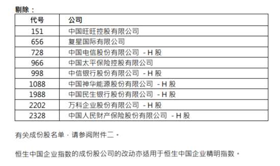 中國旺旺、復(fù)星國際、中國電信、中國太保(601601,股吧)、中國神華、中信銀行、民生銀行(600016,股吧)、萬科企業(yè)、中國人保(601319,股吧)遭剔除。