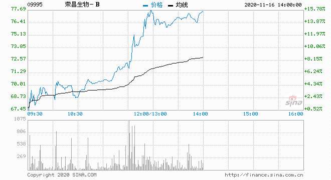 次新股榮昌生物-B(09995)盤中漲幅快速擴(kuò)大逾14%,高見77.75港元刷新上市新高,較發(fā)售價(jià)52.1港元高逾49%。截至13時(shí)37分,漲14.68%,報(bào)價(jià)76.95港元,成交額1.92億。